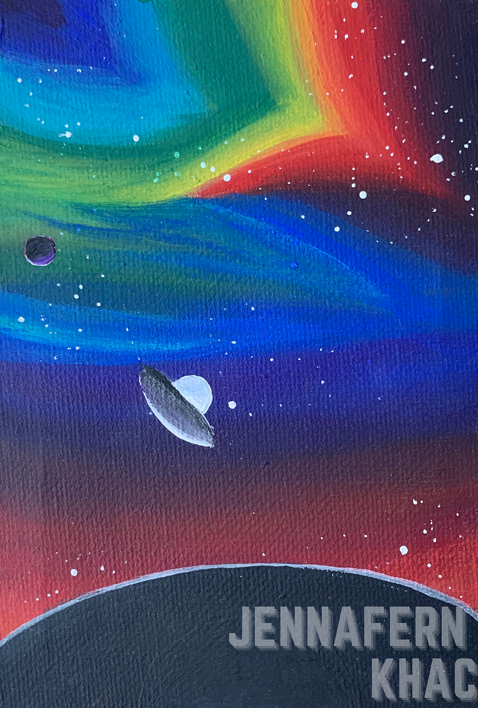 Jennafern Nelson decided she wanted to live at the age of 20. Before that, she lived roughly on the streets starting at the age of 15. A moment in the mirror and sheer gave Jenna the ability to sober herself without the use of any external services or programs. A stark realization that she wanted to grow old gave her the courage to leave her life behind and start anew in Kingston. Since then, she has grown a scholarly appreciation for theoretical physics, personal development, and philosophy. Evident in her paintings are her passion for both the universe, and life itself.